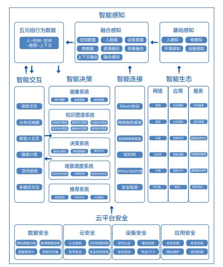 智能衔接是完成家庭大脑的根底,《白皮书》主张构建异构衔接家庭网络、构建海量衔接、网络自修复机制、自配网与网络同步机制、云边端协同机制等,以完成协同智能;作为智能决议计划的条件,智能感知经过软硬件结合,打通交互数据,树立全屋感知数据模型,构成了解用户的才智家庭感知才能,为场景集成供给支撑;智能交互是物理国际和数字国际的衔接点,经过才智算法在家庭大脑中会聚、重组,完成人与物、物与物交互,为用户供给继续交互服务。