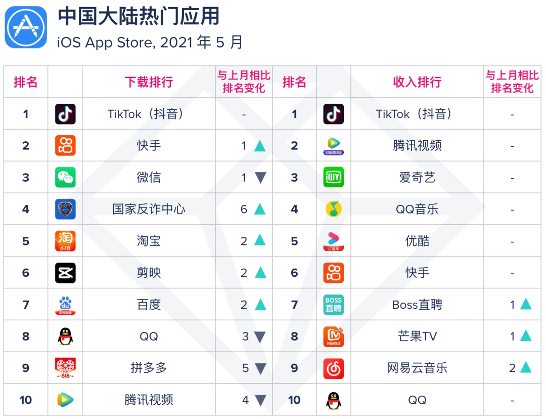 5 月我国大陆抢手 iOS 使用中热销榜根本与上月共同,《抖音》、《腾讯视频》、《爱奇艺》保持在收入前三名。《Boss直聘》和《芒果TV》收入均上升 1 名,《网易云音乐》 5 月上升 2 名,位列第 9。下载榜中,上月新上榜的电信网络安全 App《国家反诈中心》下载量持续上升,5 月上升 6 位,跻身下载榜前 5。