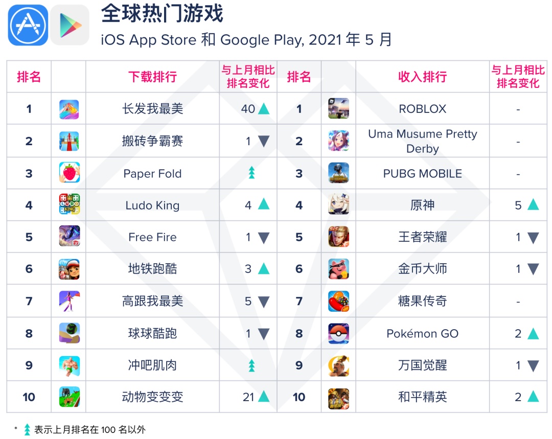 5 月全球游戏热销榜改变不大,ROBLOX、Uma Musume Pretty Derby、PUBG MOBILE 收入稳步上升,保持在收入榜前三。《原神》上升 5 名排名第 4,收入增速亮眼,主要由美国、我国、日本、韩国区域拉动。