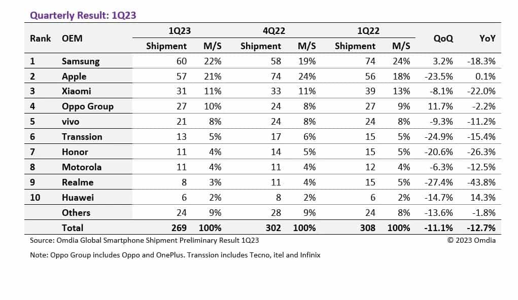 Omdia:全球智能手机市场需求仍然低迷,三星和小米 Q1 大幅下滑